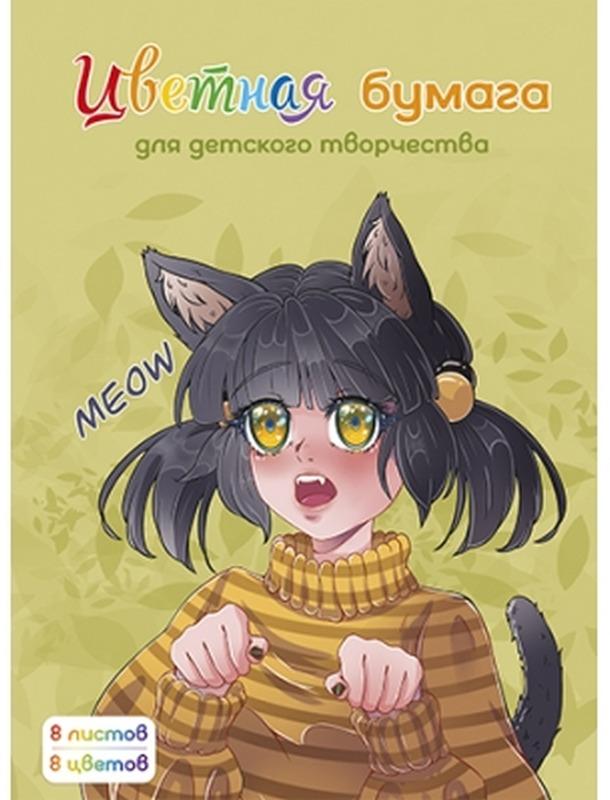 Бумага цветная А4 8л. 8цв. Альфа-Тренд 130030 "Анимэ мяу" на скобе, мелованная