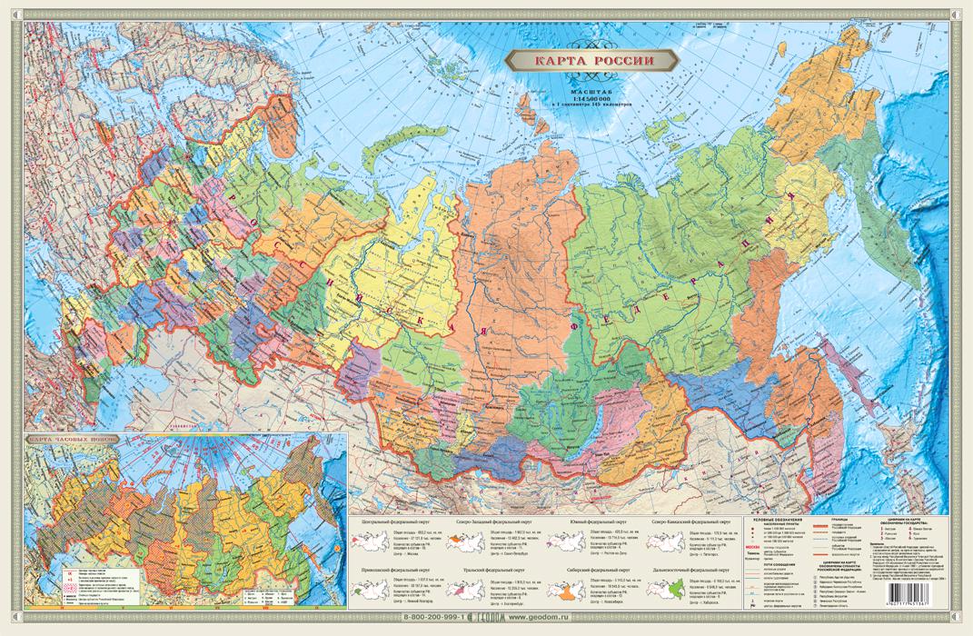 Карта России.Политико-административная 1:4М настенная лам.в тубусе 764 Нов регионы