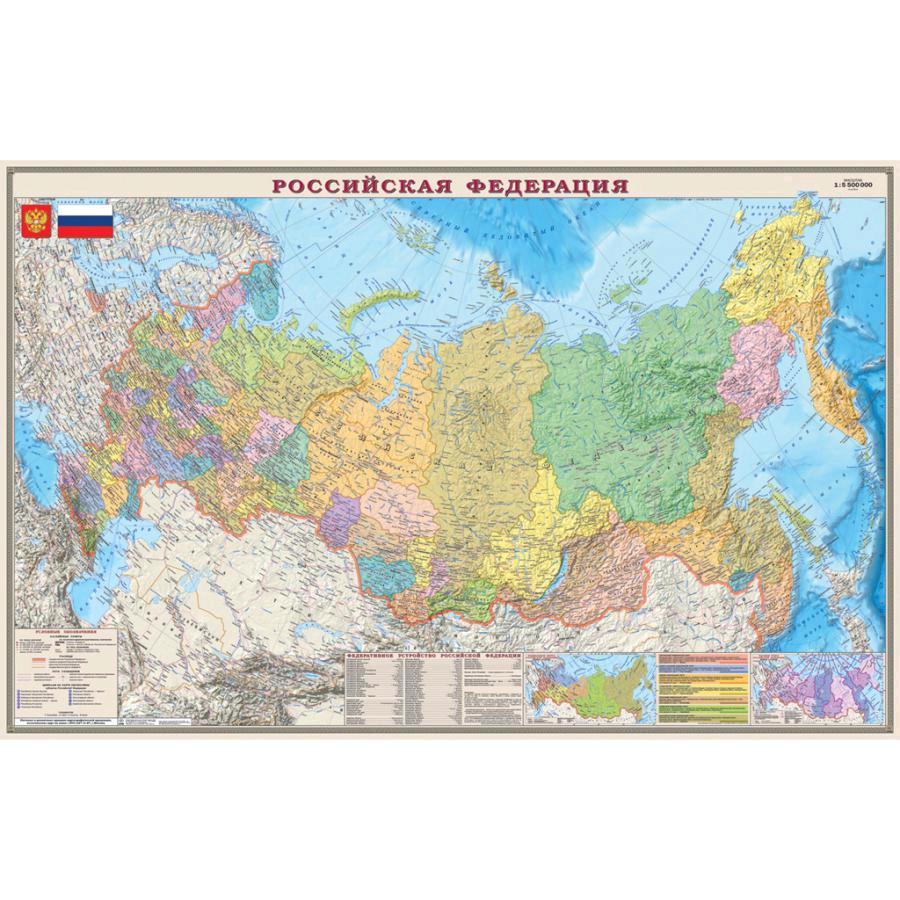 Карта России.Политико-административная 1:5,5М настенная ламинир 654 Нов регионы