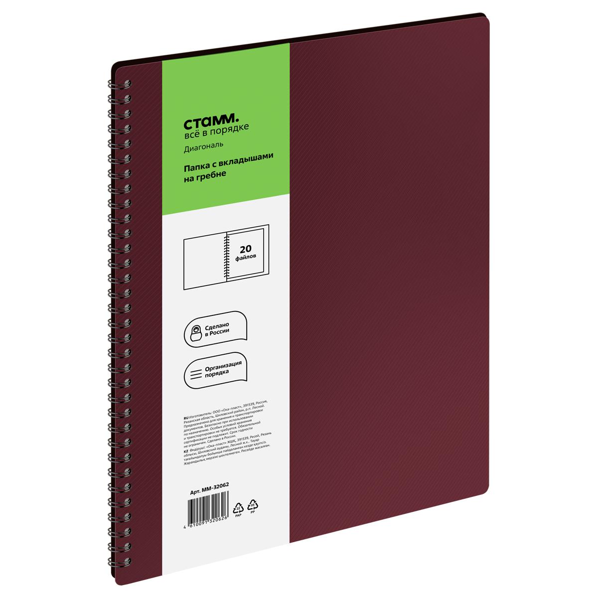 Папка 20 вкладышей Стамм ММ-32062 "Диагональ" А4, гранат 14мм, 700мкм, на спирали 377853
