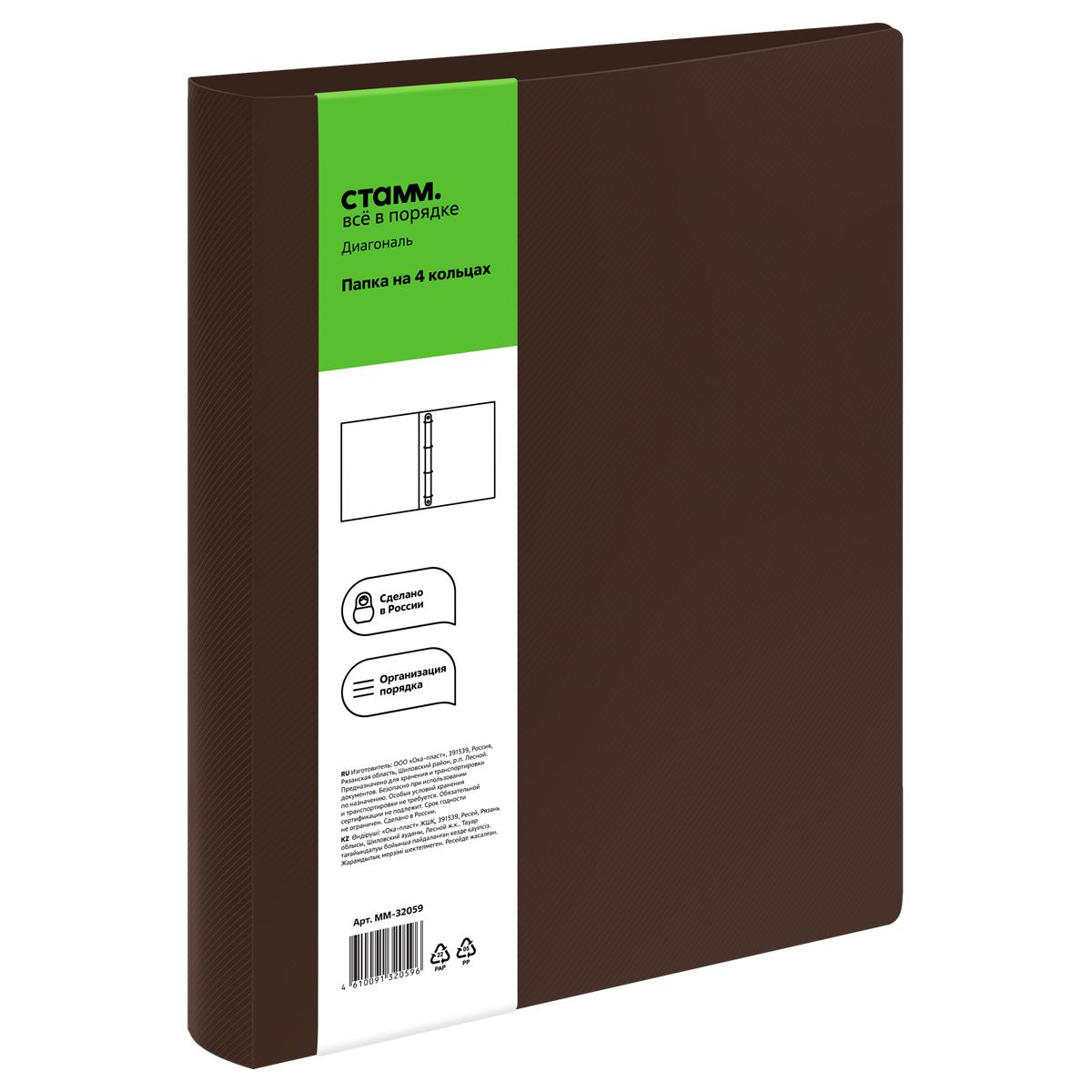 Папка зажим 4 кольца 40мм А4 Стамм ММ-32059 "Диагональ" шоколад, 700мкм 377848