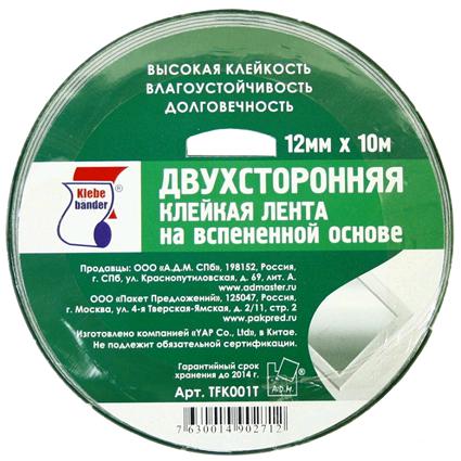 Скотч 12мм*10м двусторонний, на вспененной основе TFK001T /Klebebender/